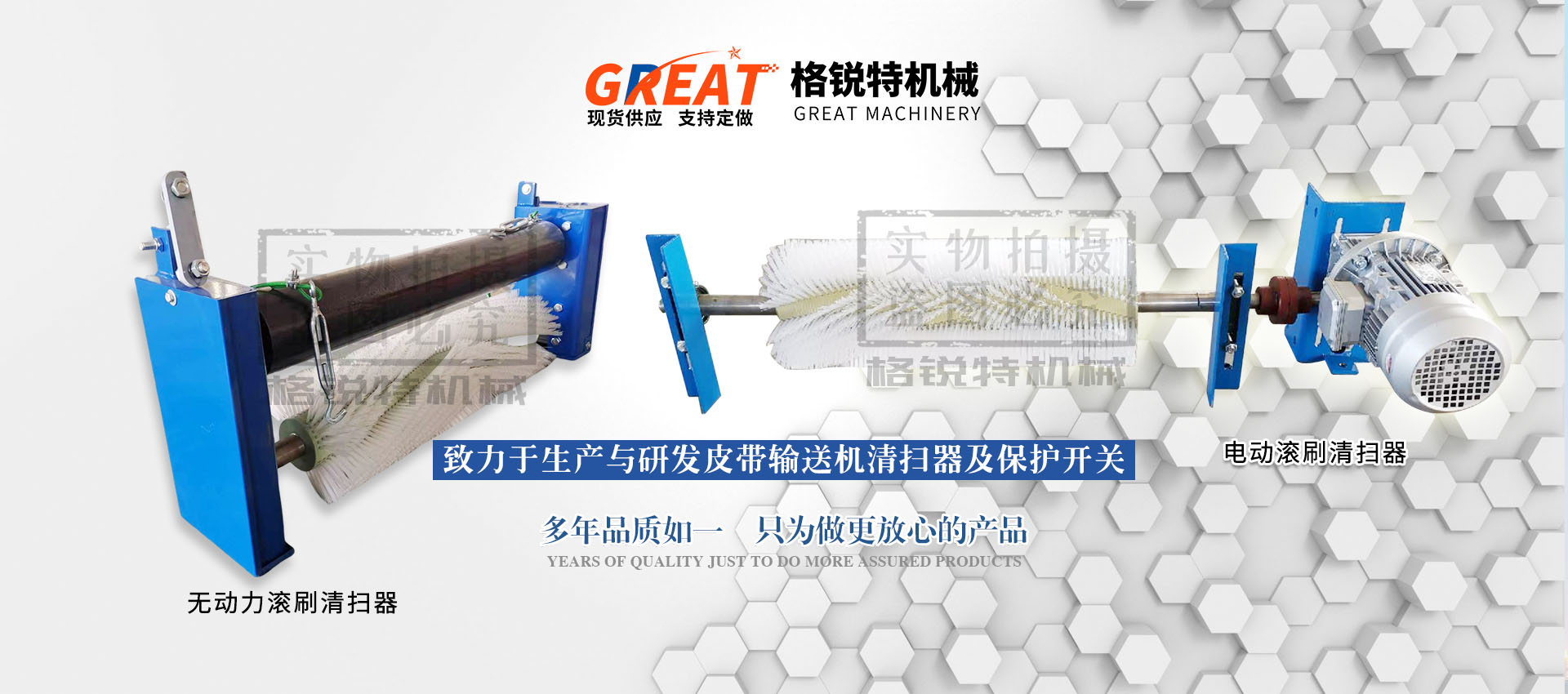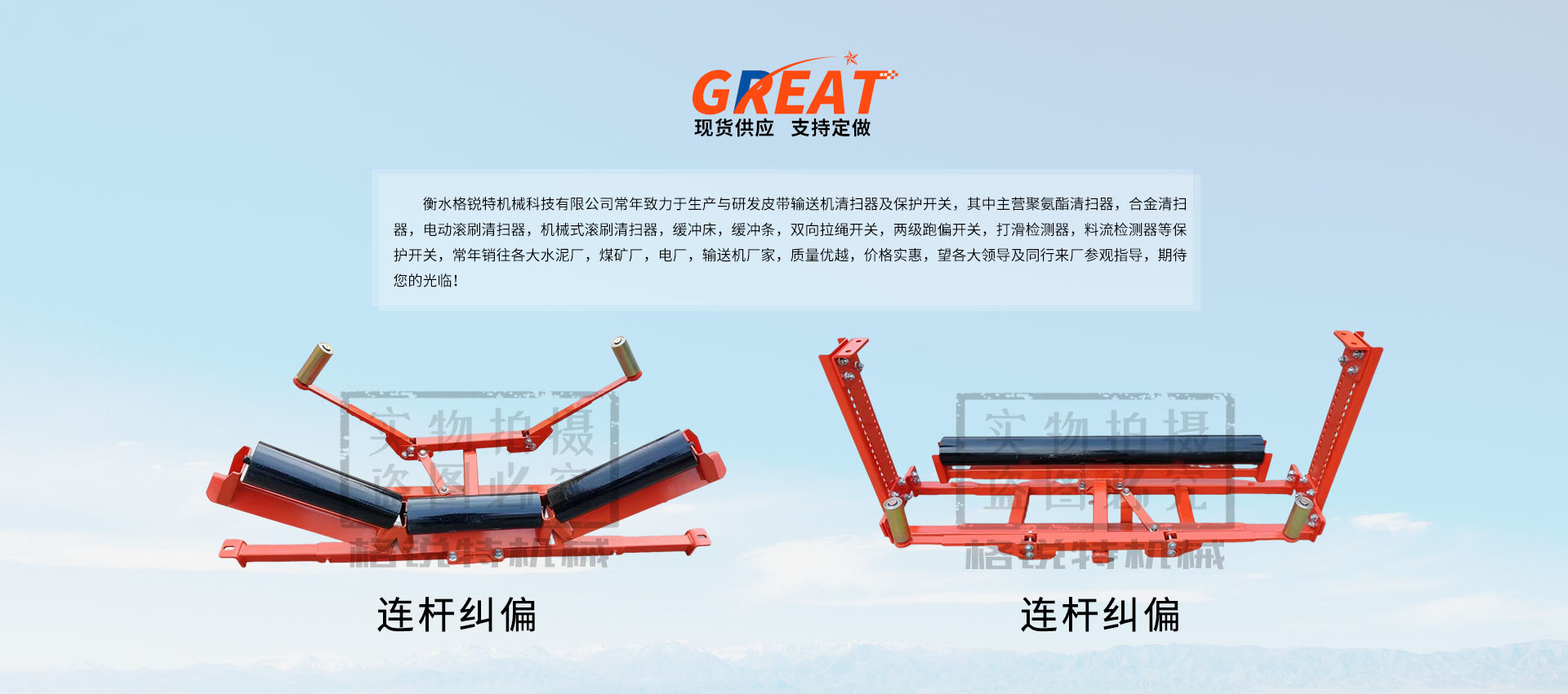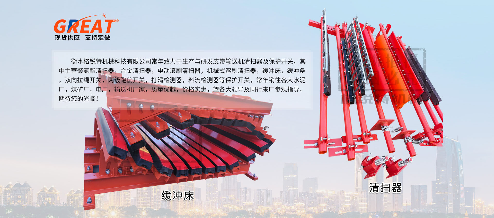 衡水格銳特機(jī)械科技有限公司常年致力于生產(chǎn)與研發(fā)皮帶輸送機(jī)清掃器及保護(hù)開(kāi)關(guān),其中主營(yíng)聚氨酯清掃器,合金清掃器,電動(dòng)滾刷清掃器,機(jī)械式滾刷清掃器,緩沖床,緩沖條,雙向拉繩開(kāi)關(guān),兩級(jí)跑偏開(kāi)關(guān),打滑檢測(cè)器,料流檢測(cè)器等保護(hù)開(kāi)關(guān),常年銷(xiāo)往各大水泥廠(chǎng),煤礦廠(chǎng),電廠(chǎng),輸送機(jī)廠(chǎng)家,質(zhì)量?jī)?yōu)越,價(jià)格實(shí)惠,望各大領(lǐng)導(dǎo)及同行來(lái)廠(chǎng)參觀(guān)指導(dǎo),期待您的光臨!!!